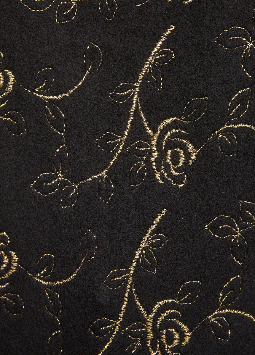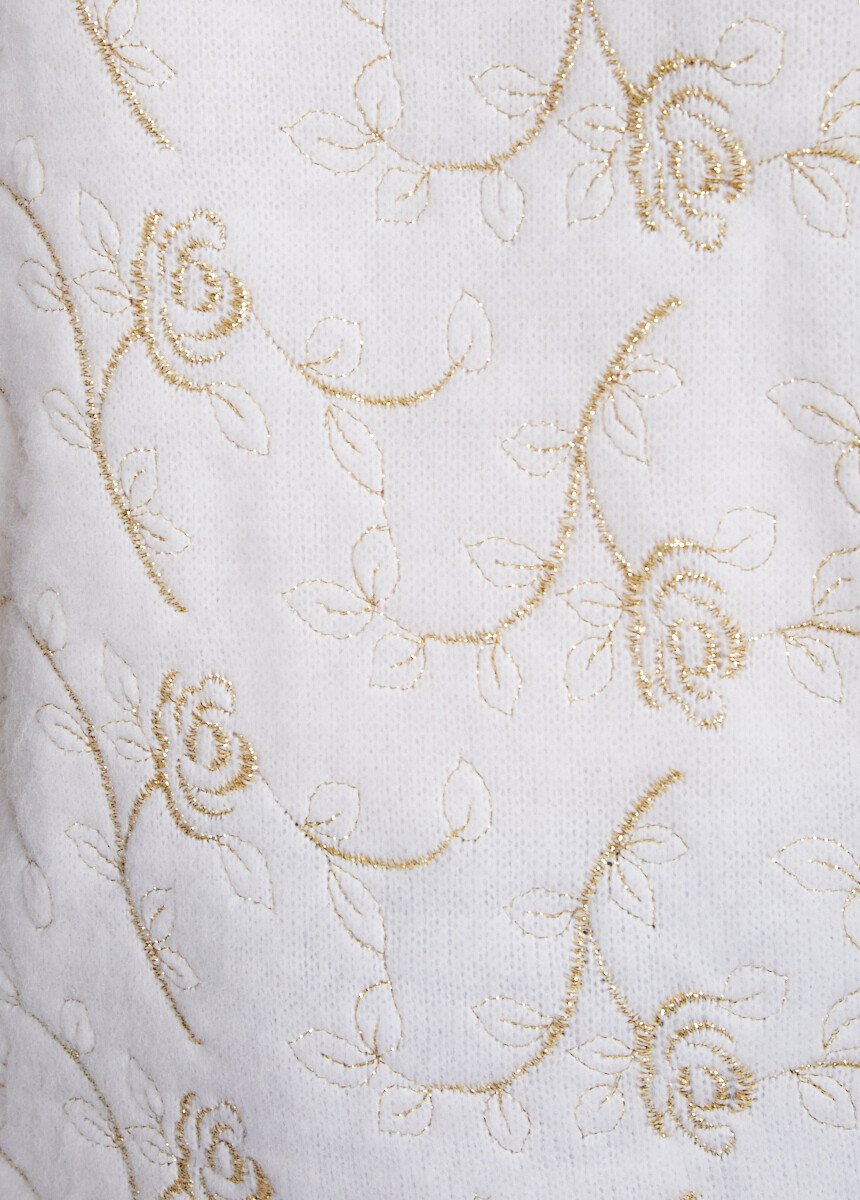 Such a seductive sweater! Its soft look (the knit is brushed for extra loft and warmth) is complemented by the beauty of the gold-colored thread appliqués on the front. The slightly shouldered shoulders and long, gathered sleeves ensure a perfect silhouette. Finished with ribbed edges.