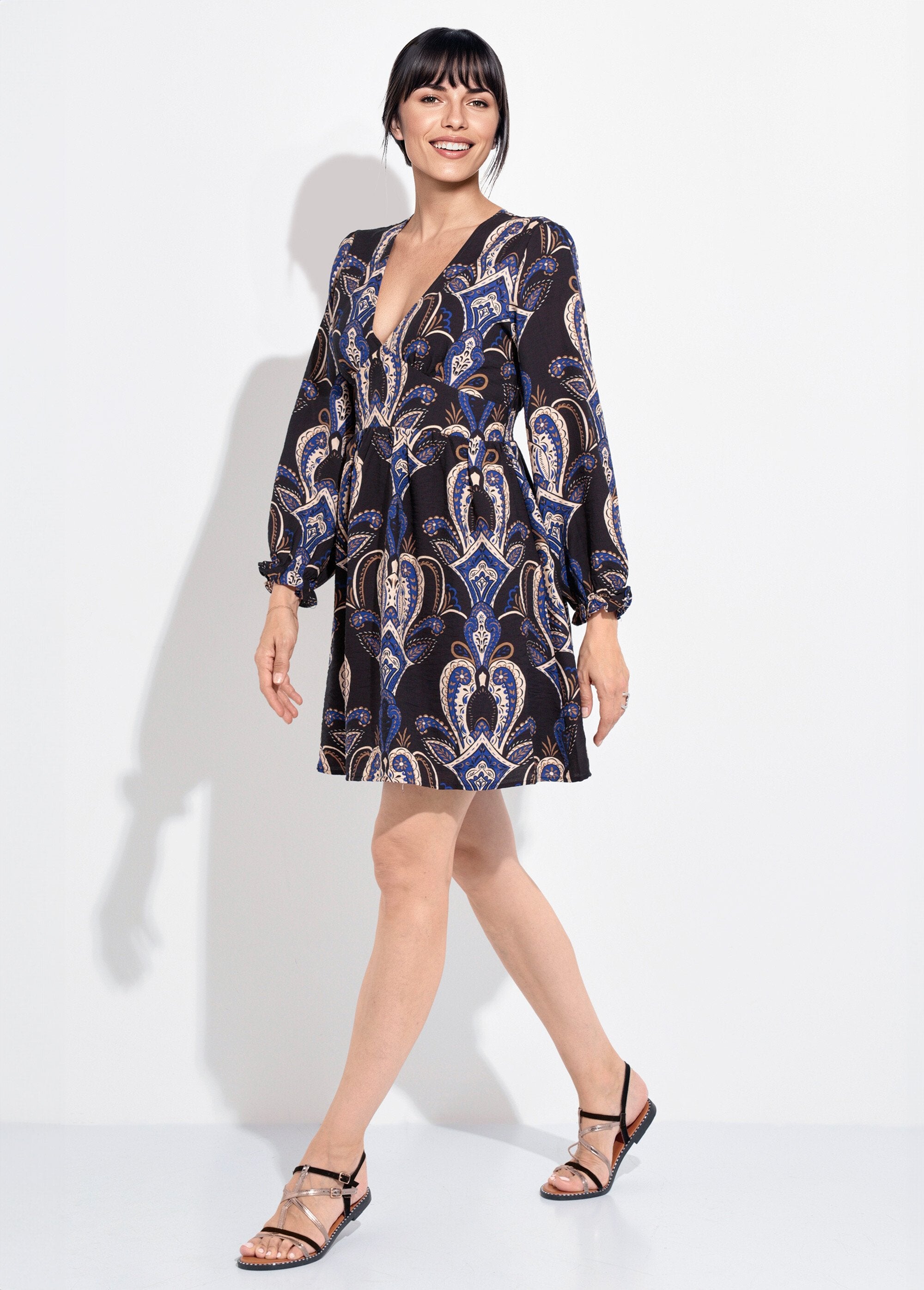 This short V-neck dress with a paisley print is a must-have for those who want to combine comfort and elegance. Its flattering cut enhances the silhouette while offering significant freedom of movement. The loose, rich patterns of its print add a touch of sophistication, ideal for special occasions or casual outings. Paired with simple accessories, this piece becomes a true fashion statement. Opt for an elegant long-sleeved dress that will enhance your look while guaranteeing a chic and refined style.