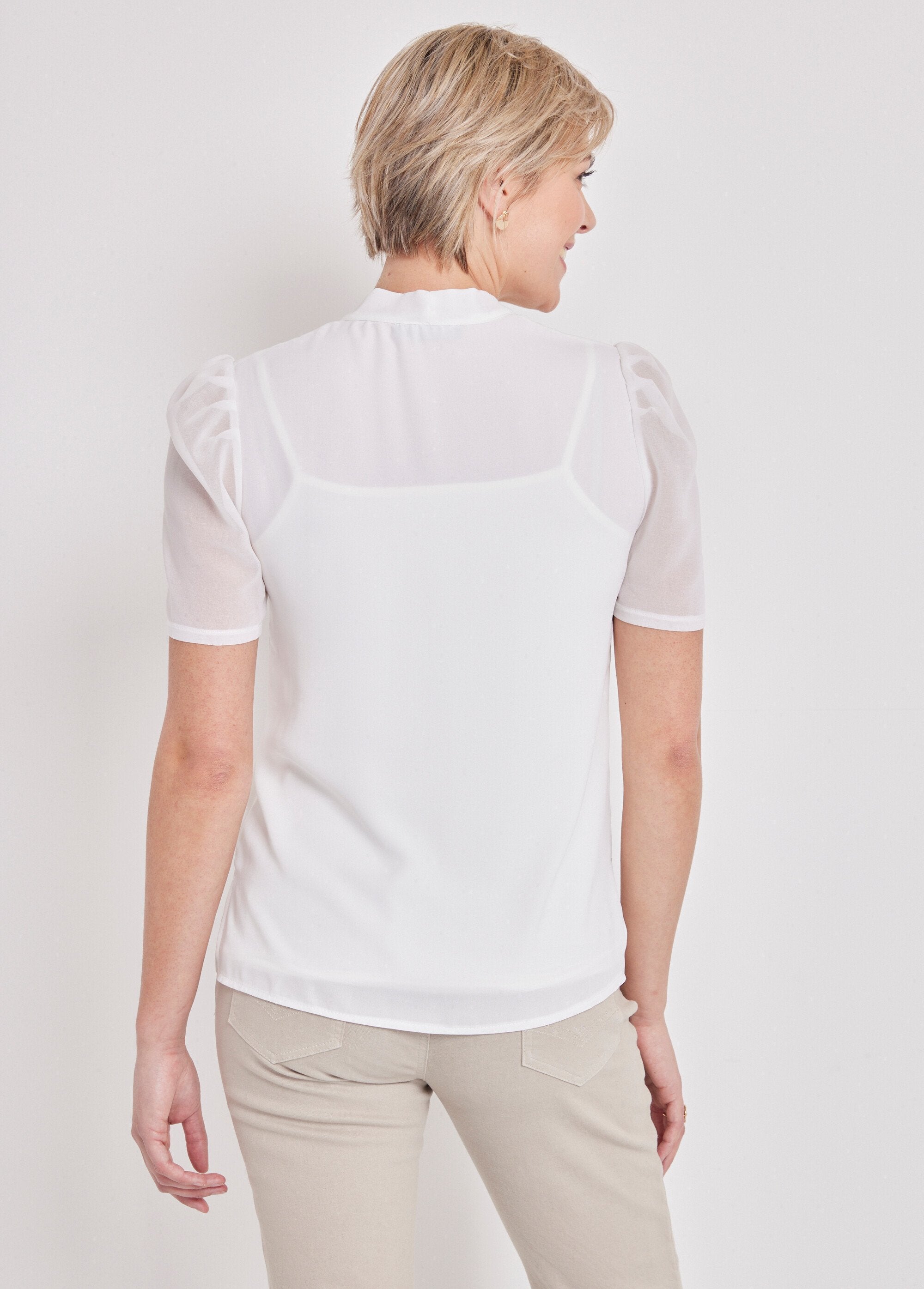 A lovely play of prints and materials for a chic tunic perfect for any occasion. V-neckline enhanced by a lavallière tie. Gold-tone bias on front shoulder seams. Short sleeves and lavallière in printed voile. Rounded base with side slits. Made in France.