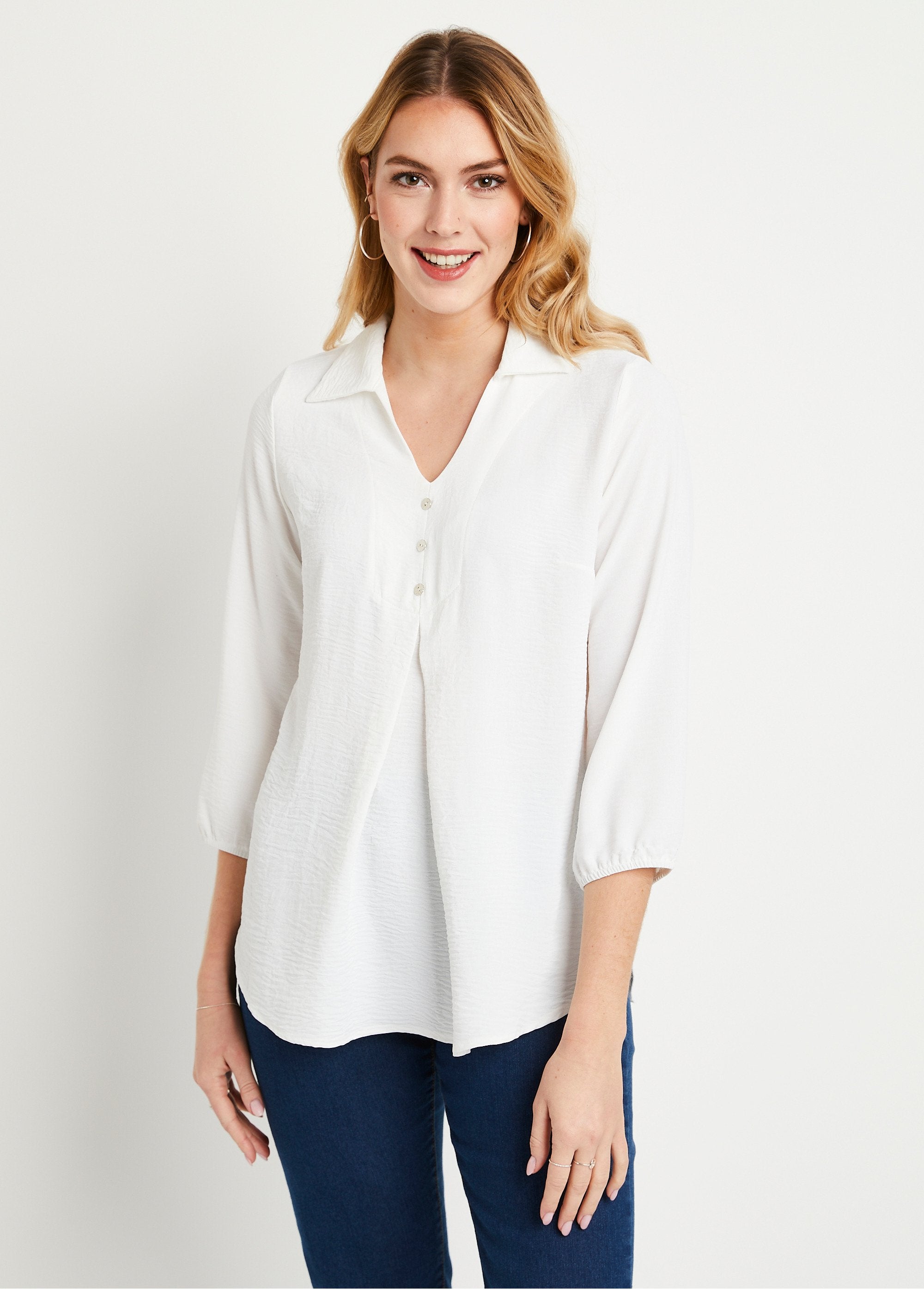 With its cool look without being too casual, the 3/4 sleeve tunic has a great style with a simple, but effective cut. Its shirt collar is open in a V with a false button front. And to give it fullness: a box pleat at the front and another under the middle cutout at the back. French made.